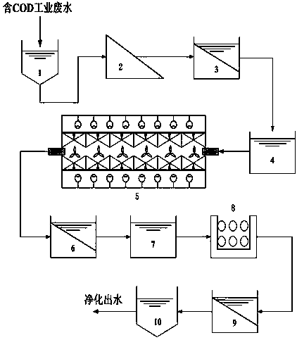 工業(yè)廢水通過廢水管線進入集水井,集水井的出口通過廢水管線連接粗格柵,粗格柵的出口通過廢水管線連接一次沉淀池,一次沉淀池的出口通過廢水管線連接pH值調(diào)節(jié)池,pH值調(diào)節(jié)池的出口通過廢水管線連接納米微孔超聲波間歇聚合反應槽,納米微孔超聲波間歇聚合反應槽的出口通過廢水管線連接二次沉淀池,二次沉淀池的出口通過廢水管線連接曝氣硝化池,曝氣硝化池的出口通過廢水管線連接生物脫氮池,生物脫氮池的出口通過廢水管線連接三次沉淀池,三次沉淀池的出口通過廢水管線連接凈水池,凈水池的出口通過廢水管線將經(jīng)過本系統(tǒng)處理后的凈化出水外排;其中,納米微孔超聲波間歇聚合反應槽的槽體采用高強度玻璃鋼材質(zhì),其頂板和底板上各并排裝有8支超聲波發(fā)生器,槽體中部設有上、下兩道不銹鋼網(wǎng)狀龍骨,分別用于固定上、下兩組納米微孔表面聚合體,兩組納米微孔表面聚合體中央安裝了6支攪拌槳葉,槽體左側設有進水閥門,右側設有出水閥門;經(jīng)過酸化的工業(yè)廢水通過納米微孔超聲波間歇聚合反應槽左側的進水閥門進入反應槽內(nèi)部,16支超聲波發(fā)生器開始工作,發(fā)出超聲波,廢水中的有機物在超聲波協(xié)同化學效應的作用下,在納米微孔表面聚合體的表面發(fā)生C-H鍵的短暫斷裂,由于納米微孔表面聚合體材料中添加有能夠催化聚合反應進行的氯化烯丙基鈀二聚物,在其催化聚合作用下,已經(jīng)斷裂的C-H鍵會迅速在納米微孔表面聚合體的納米孔隙處發(fā)生C-H鍵的再結合,從而在納米微孔表面聚合體的表面發(fā)生聚合反應,超聲波發(fā)生器開啟一定時間后即停止工作,同時兩組納米微孔表面聚合體中央的6支攪拌槳葉同時開始攪拌以產(chǎn)生液體湍流作用,這會使剛剛形成的有機物聚合體的分子量不斷增大,逐步匯聚成大顆粒的不溶物質(zhì)并從納米微孔表面聚合體表面脫落,以懸浮物的形式分散于廢水中,并隨廢水通過反應槽右側的出水閥門排出反應槽,進入二次沉淀池,并最終通過沉淀過程從廢水中加以除去,同時,納米微孔超聲波間歇聚合反應槽中的攪拌槳葉停止工作,超聲波發(fā)生器重新開啟,并通過進水閥門重新注入廢水,開始新一輪催化聚合反應過程,如此往復循環(huán);其中,pH值調(diào)節(jié)池的作用是將經(jīng)過一次沉淀的廢水pH值調(diào)節(jié)至1.5~3.0,以滿足納米微孔超聲波間歇聚合反應槽的入水pH值要求;其中,曝氣硝化池的作用是通過好氧曝氣過程,使廢水中的各種含氮物質(zhì)均轉(zhuǎn)化為硝酸鹽氮;其中,生物脫氮池的作用是通過生物活性反應過程,將廢水中的硝酸鹽氮分解轉(zhuǎn)化,從而去除硝酸鹽氮。