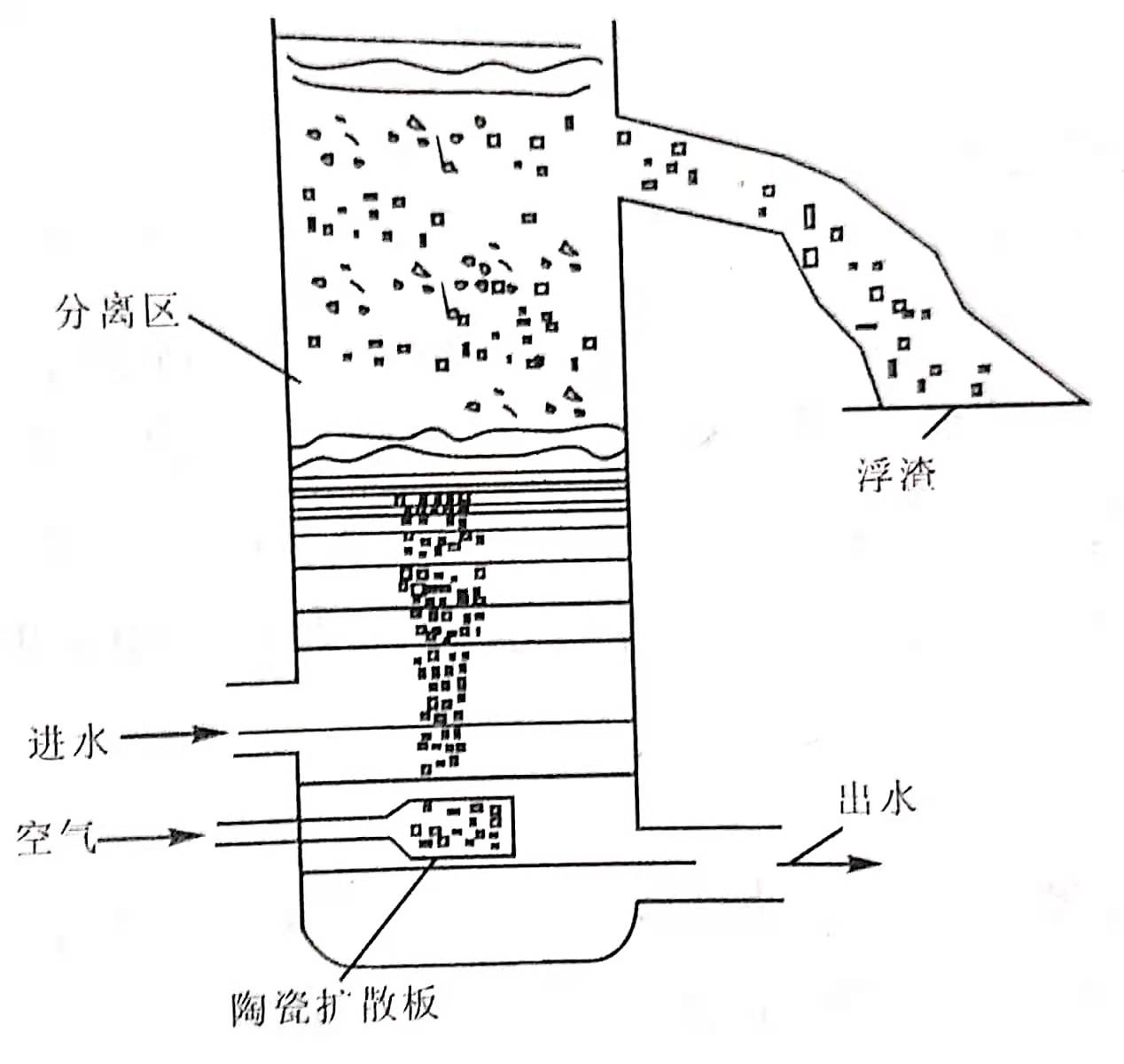 曝氣氣浮一般采用鼓風機將空氣直接送至氣浮池充氣器,形成細小氣泡進入污水中。充氣器一般用擴散板、穿孔板或微孔管等,曝氣壓力在1kg/cm2,空氣量2-3m3/m3水。擴散裝置的微孔不宜過小,否則易于堵塞;而微孔板孔徑過大,必須投加表面活性劑,方可形成可利用的微小氣泡,從而導致該種方法使用受到限制。近年研制、開發(fā)的彈性膜微孔曝氣器克服了擴散裝置微孔易堵或孔徑大等缺點。擴散板曝氣氣浮示意圖見下圖。