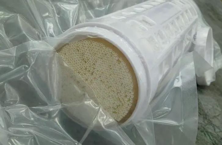 一個(gè)中空纖維超濾膜組件主要是由成百到上千根中空纖維絲和膜殼兩部分組成,一般將中空纖維內(nèi)徑在0.6-6mm之間的超濾膜稱為毛細(xì)管式超濾膜,毛細(xì)管式超濾膜因內(nèi)徑較大,因此不易被大顆粒物質(zhì)堵塞,更適用于過濾原液濃度較大的場(chǎng)合。